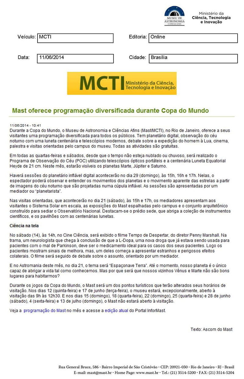 MCTI | MAST oferece programação diversificada durante Copa do Mundo