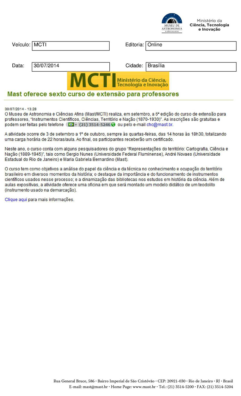 MCTI | MAST oferece sexto curso de extensão para professores