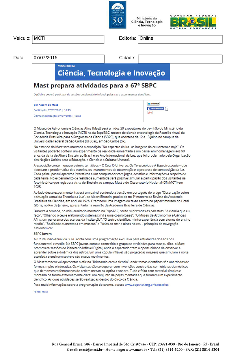 MCTI | MAST prepara atividades para a 67ª SBPC