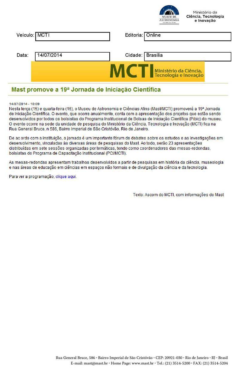 MCTI | MAST promove a 19ª Jornada de Iniciação Científica