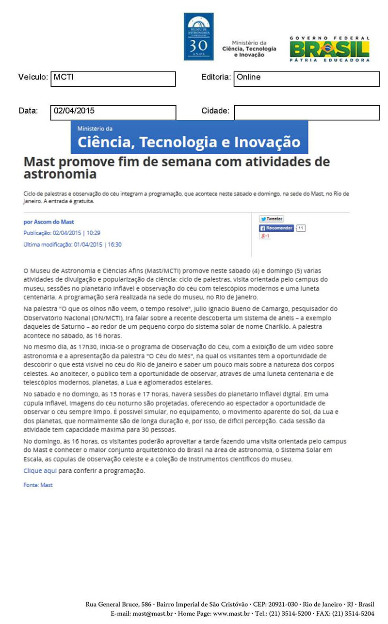 MCTI | MAST promove fim de semana com atividades de astronomia