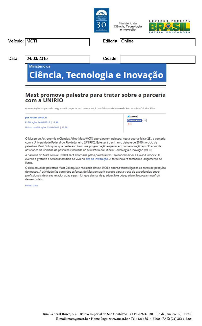 MCTI | MAST promove palestra para tratar sobre a parceria com a UNIRIO