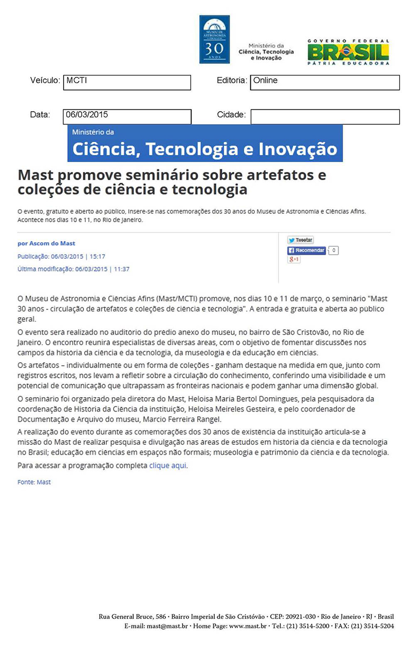 MCTI | MAST promove seminário sobre artefatos e coleções de ciência e tecnologia