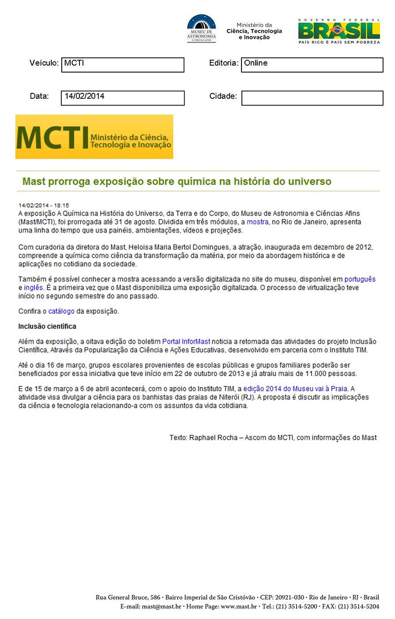 MCTI | MAST prorroga exposição sobre química na história do universo