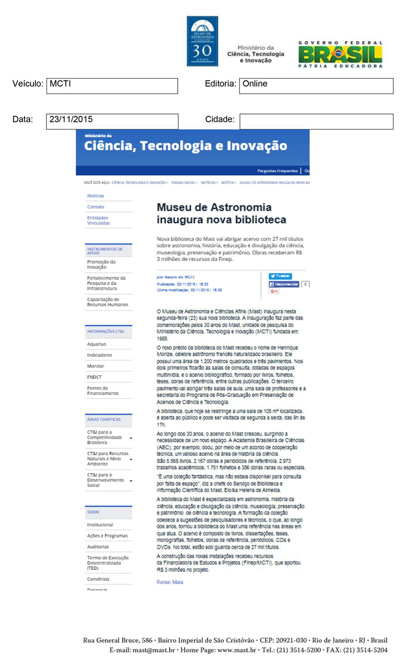 MCTI | Museu de Astronomia inaugura nova biblioteca
