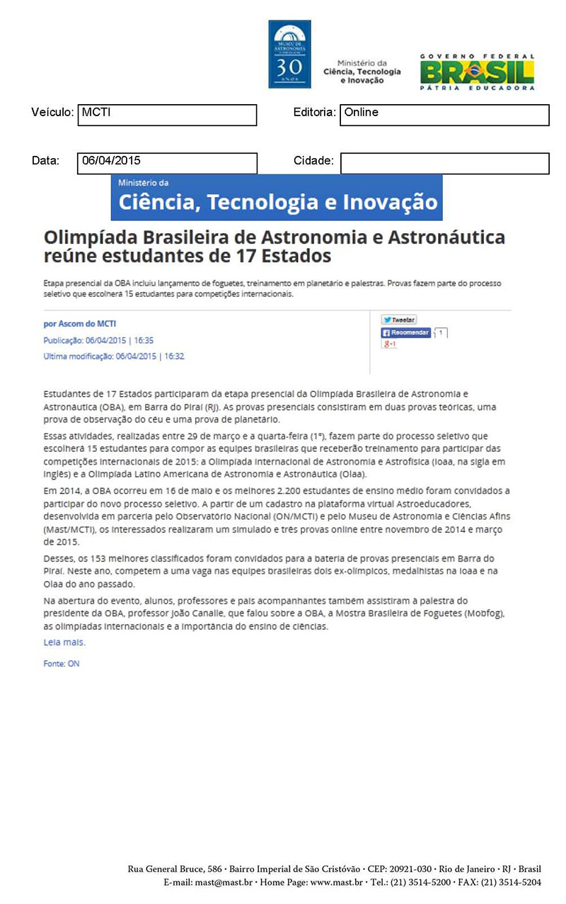MCTI | Olimpíada Brasileira de Astronomia e Astronáutica reúne estudantes de 17 Estados