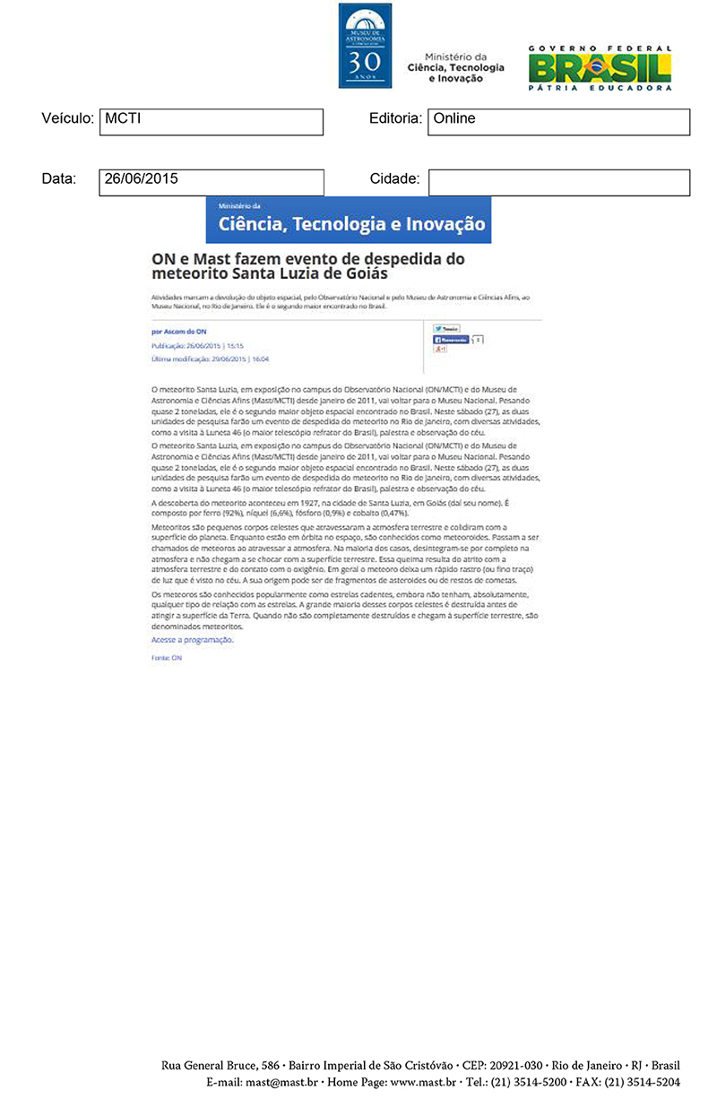 MCTI | ON e MAST fazem evento de despedida do meteorito Santa Luzia de Goiás