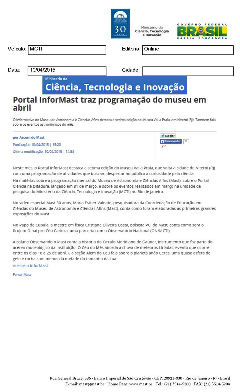 MCTI | Portal InforMAST traz programação do museu em abril