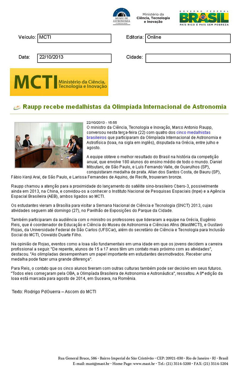 MCTI | Raupp recebe medalhistas de Olimpíada Internacional de Astronomia
