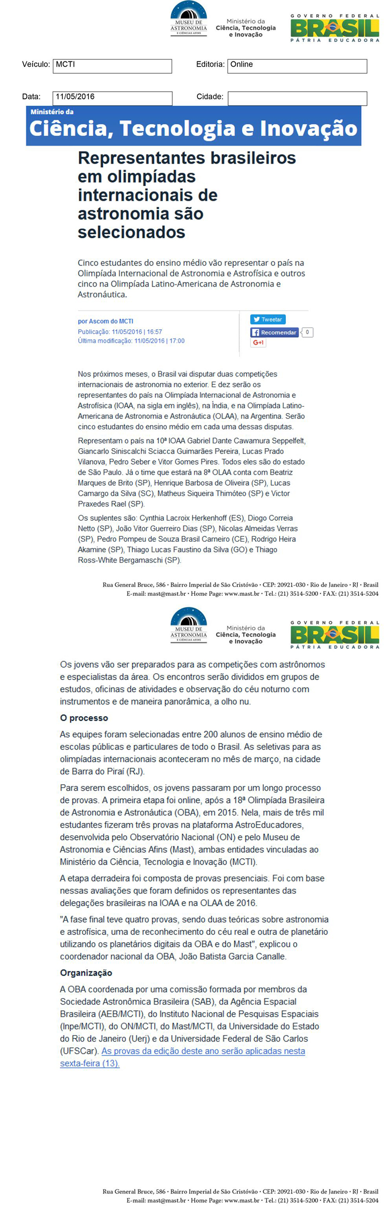 MCTI | Representantes brasileiros em olimpíadas internacionais de astronomia são selecionados