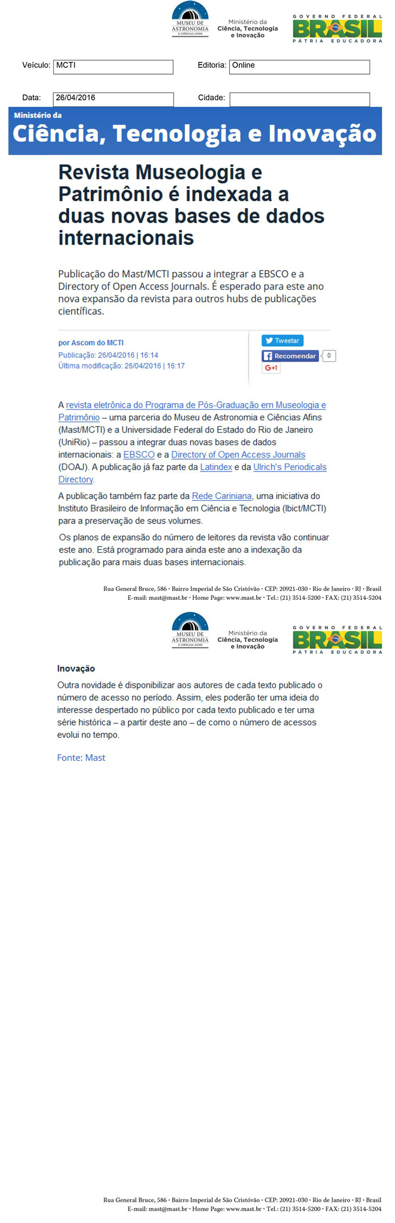 MCTI | Revista Museologia e Patrimônio é indexado a duas novas bases de dados internacionais