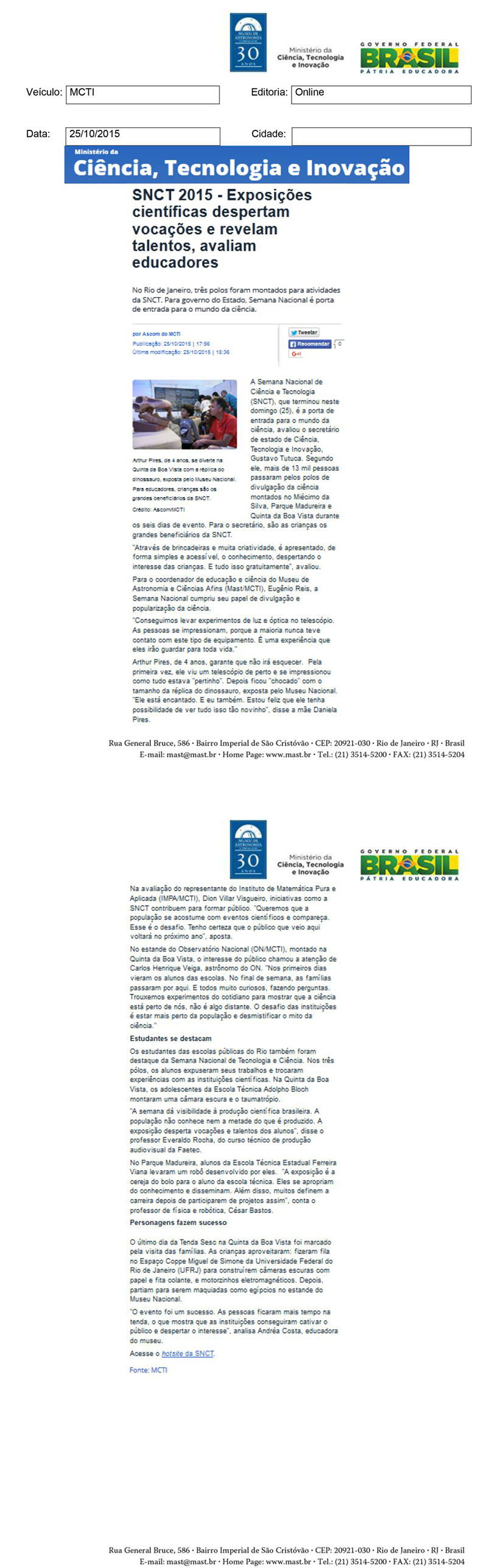 MCTI | SNCT 2015 - Exposições científicas despertam vocações e revelam talentos, avaliam educadores