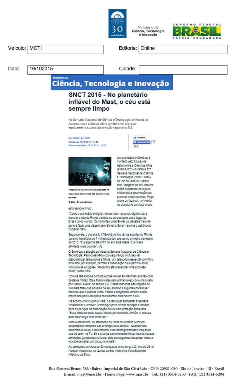 MCTI | SNCT 2015 - No planetário inflável do MAST, o céu está sempre limpo