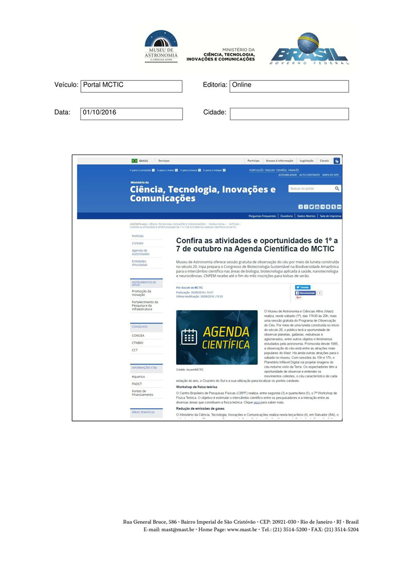 MCTIC | Confira as atividades e oportunidades de 1º a 7 de outubro na Agenda Científica do MCTIC