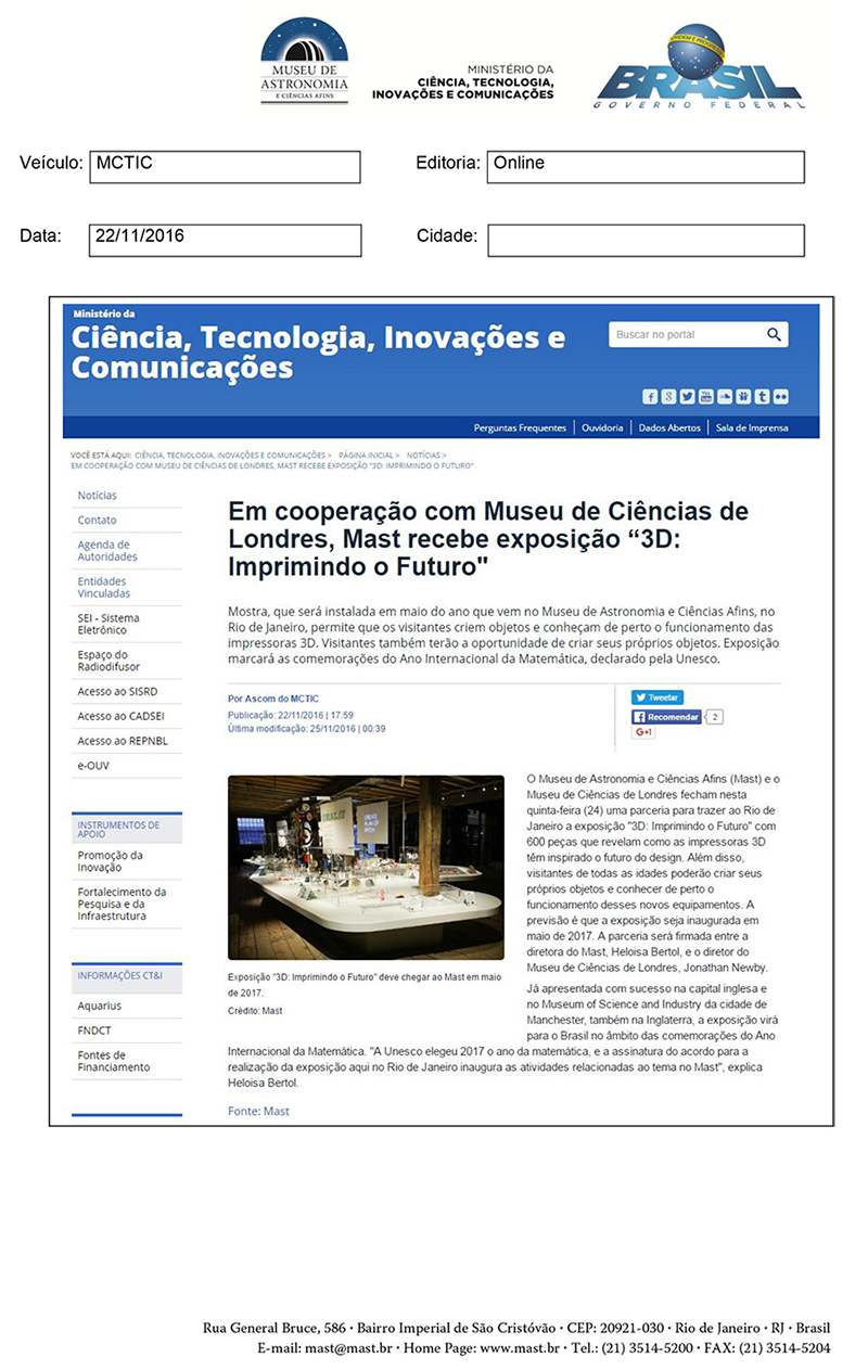 MCTIC | Em cooperação com museu de Ciências de Londres, MAST recebe exposição "3D: Imprimindo o Futuro"