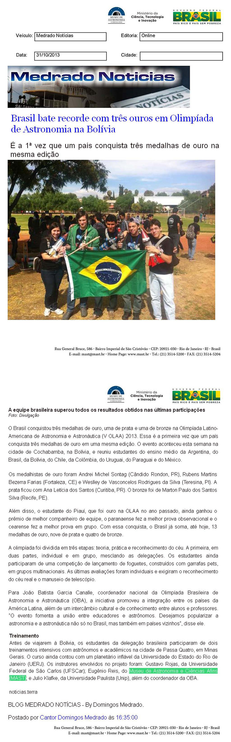 Medrado Notícias | Brasil bate recorde com três ouros em olimpíada de Astronomia na Bolívia