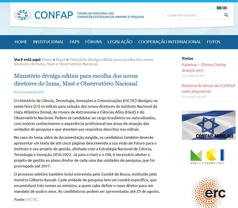 Site CONFAP | Ministério divulga editais para escolha dos novos diretores do Inma, MAST e Observatório Nacional