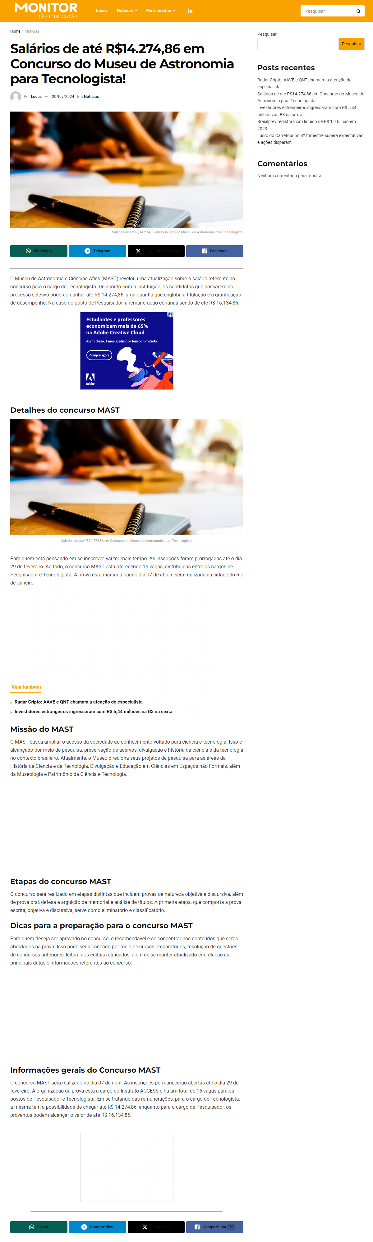 Monitor do Mercado - Salários de até R$14.274,86 em Concurso do Museu de Astronomia para Tecnologista!