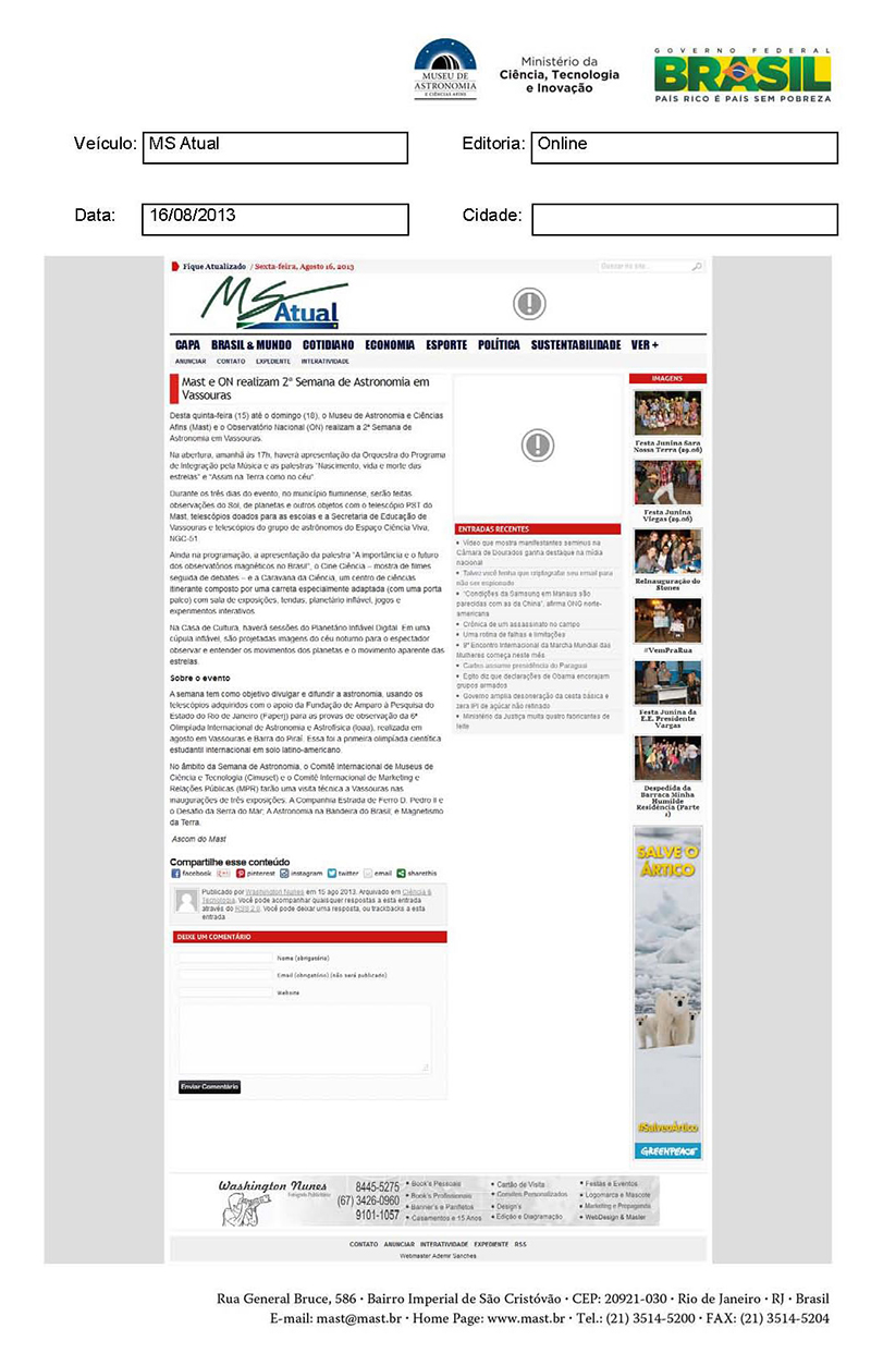 MS Atual | MAST e ON realizam 2ª Semana de Astronomia em Vassouras