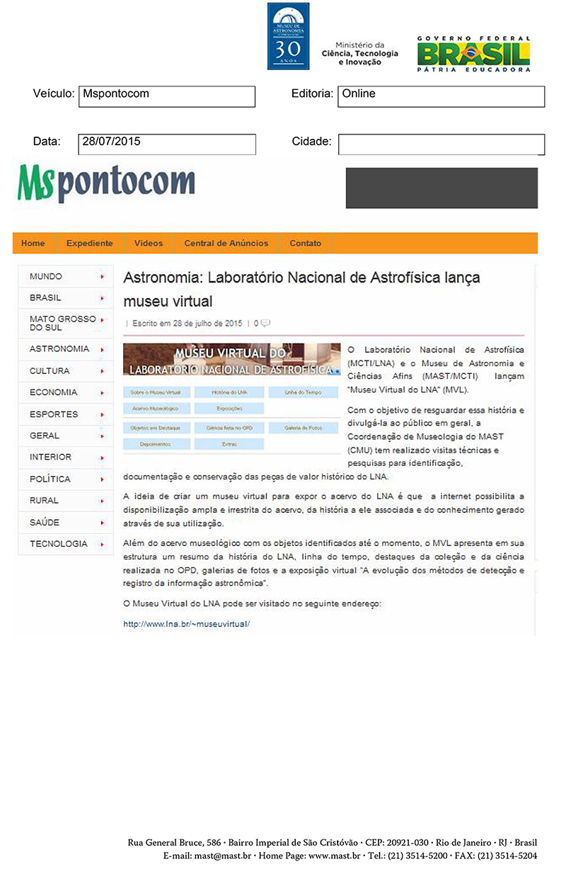 Mspontocom | Astronomia: Laboratório Nacional de Astrofísica lança museu virtual