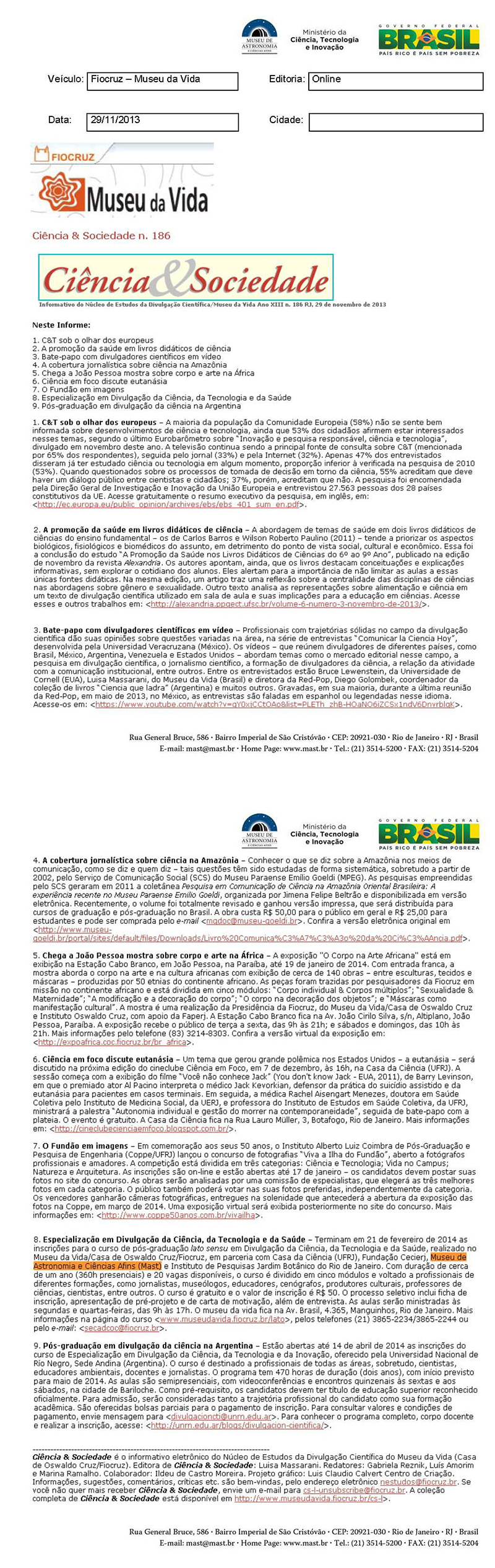 Museu da Vida - Fiocruz | Ciência & Sociedade nº 186