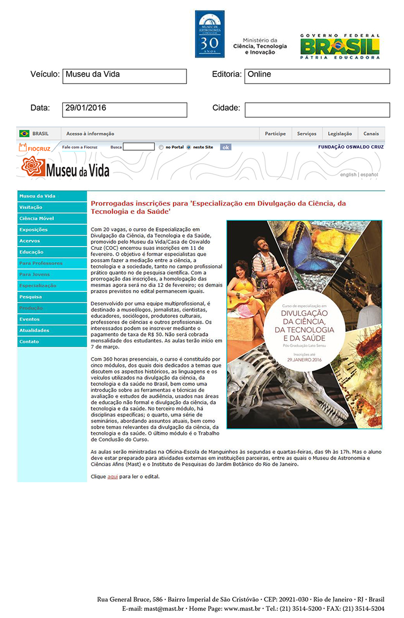 Museu da Vida | Prorrogadas inscrições para 'Especialização em Divulgação da Ciência, da Tecnologia e da Saúde'