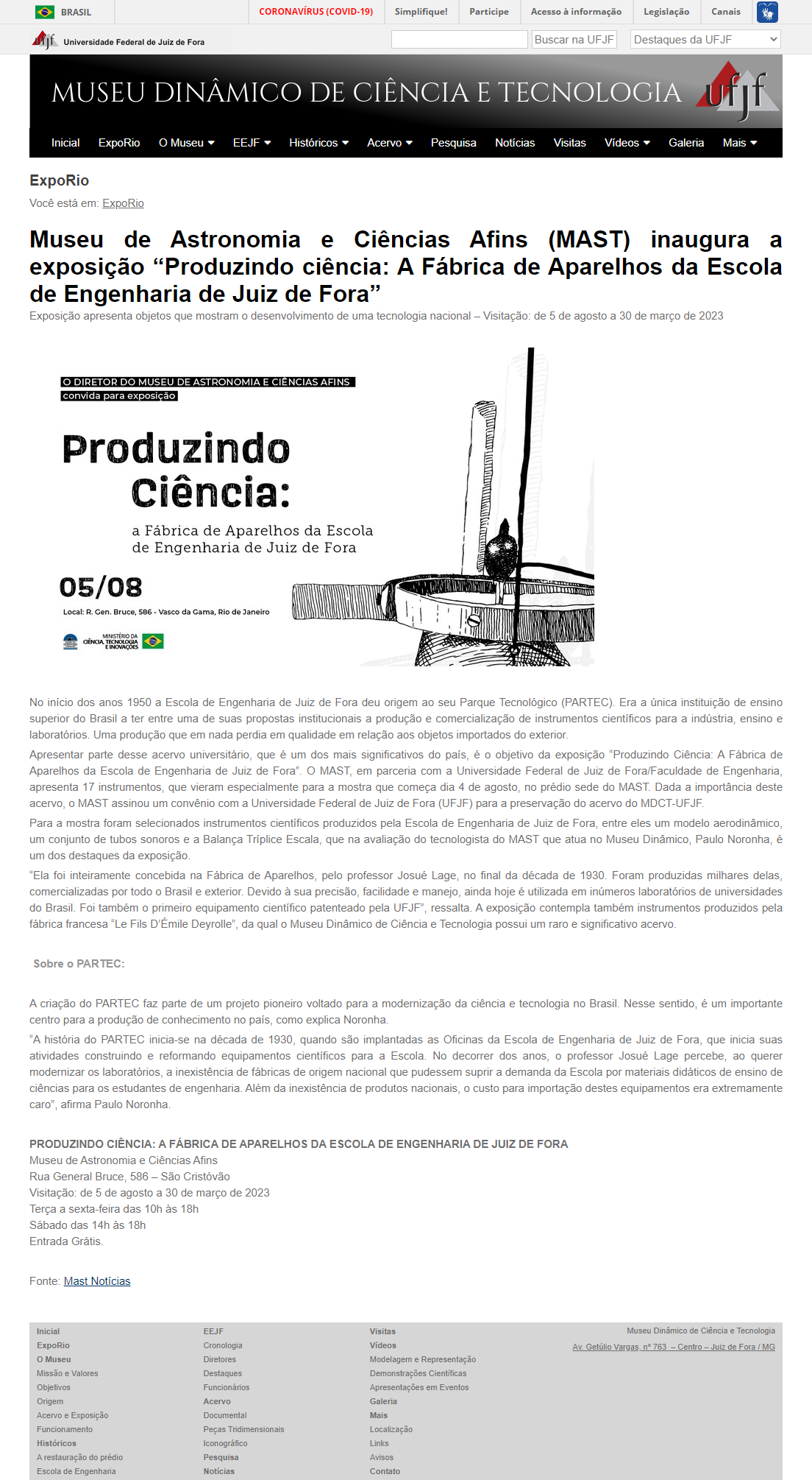 Museu Dinâmico UFJF - MAST inaugura a exposição 'Produzindo ciência: A Fábrica de Aparelhos da Escola de Engenharia de Juiz de Fora'