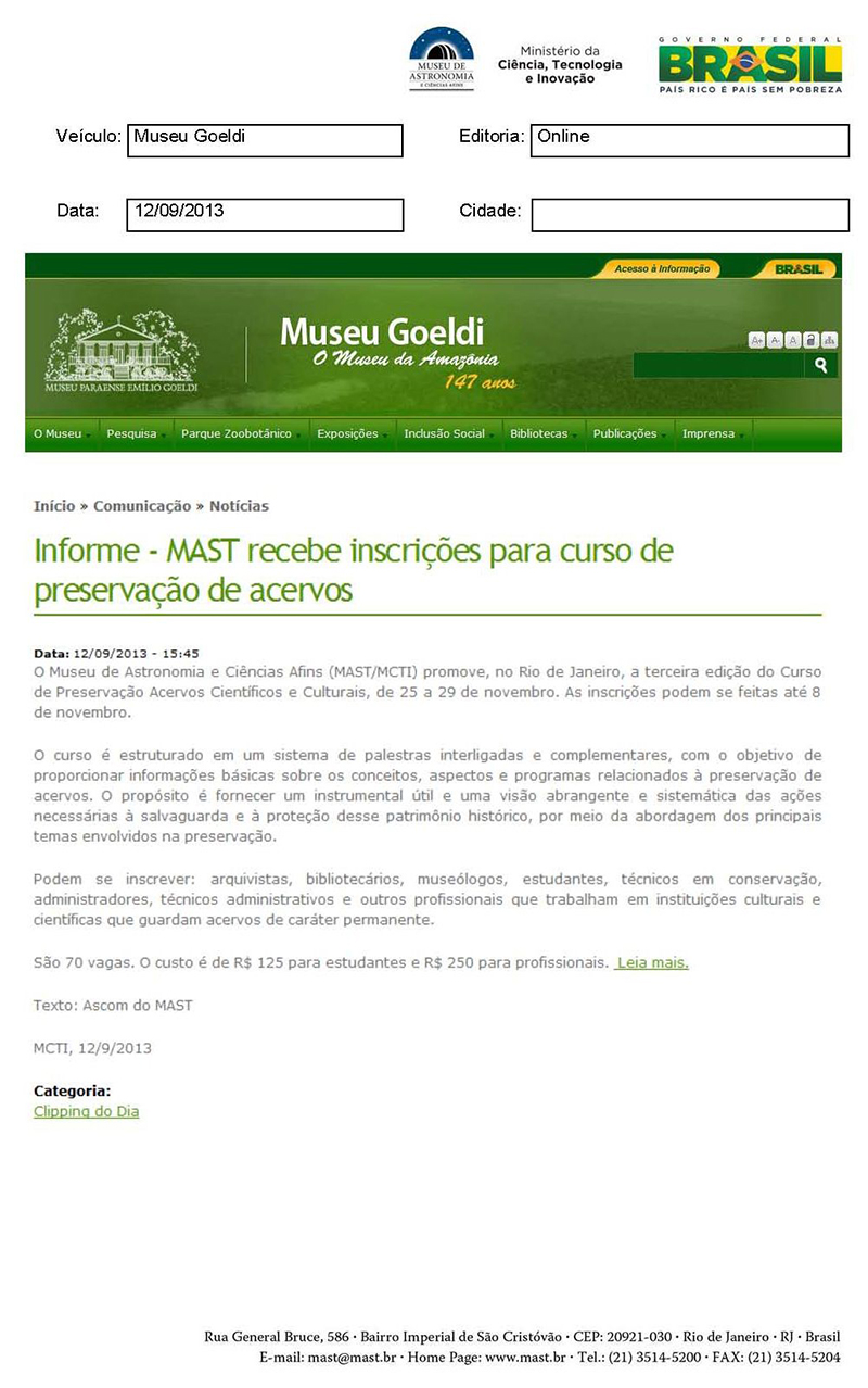 Museu Goeldi | Informe - MAST recebe inscrições para curso de preservação de acervos