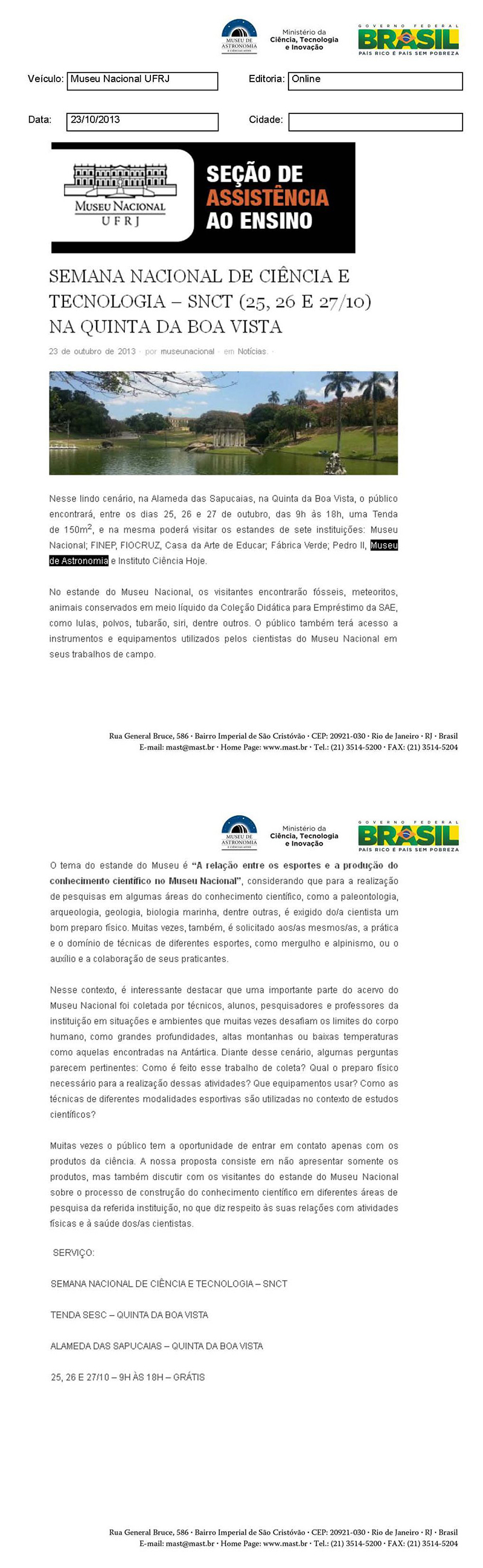 Museu Nacional | Semana Nacional de Ciência e Tecnologia - SNCT na Quinta da Boa Vista