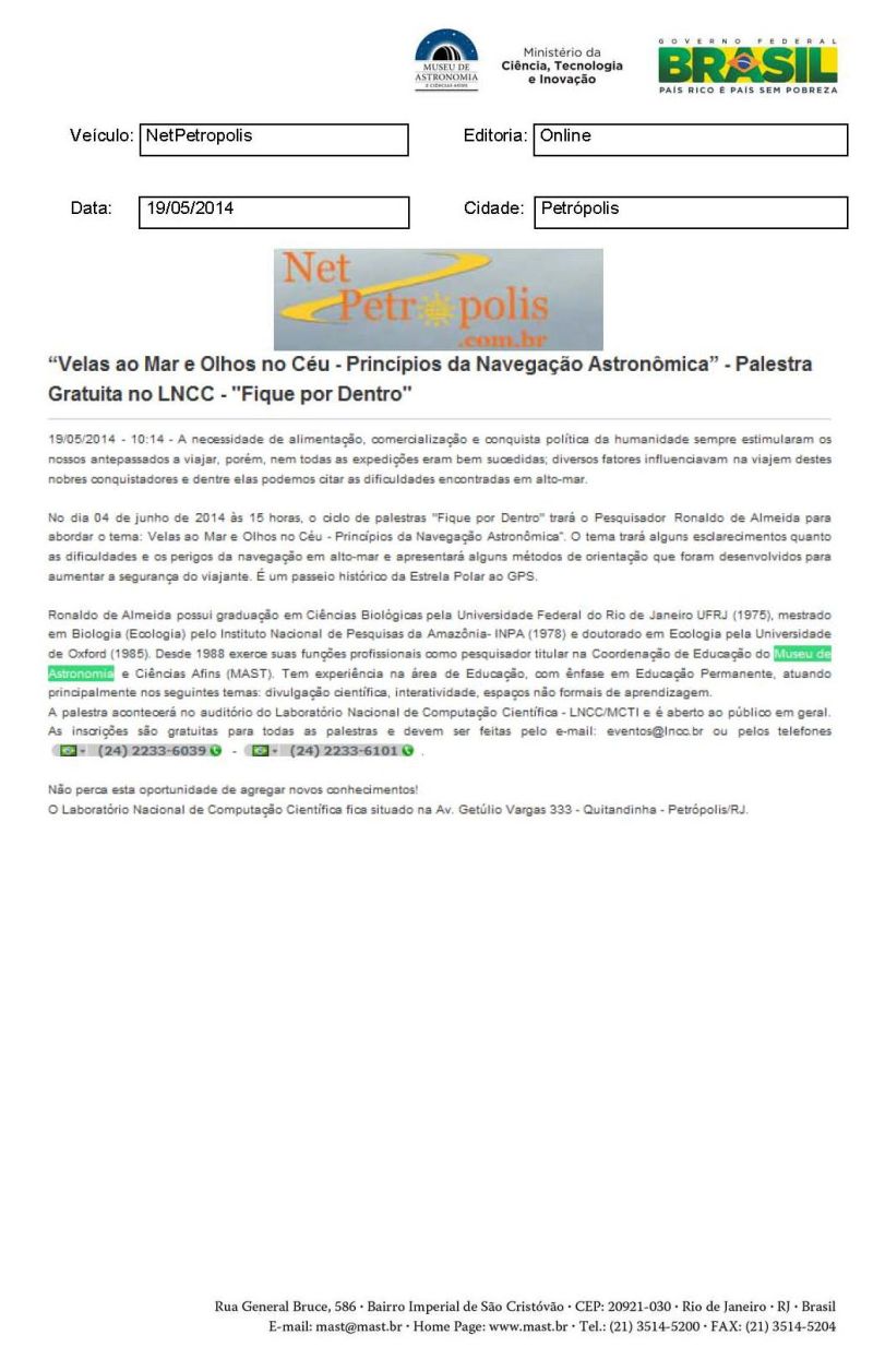 NetPetrópolis | "Velas ao Mar e Olhos no Céu - Princípios na Navegação Astronômica" - Palestra gratuita no LNCC - "Fique por Dentro"