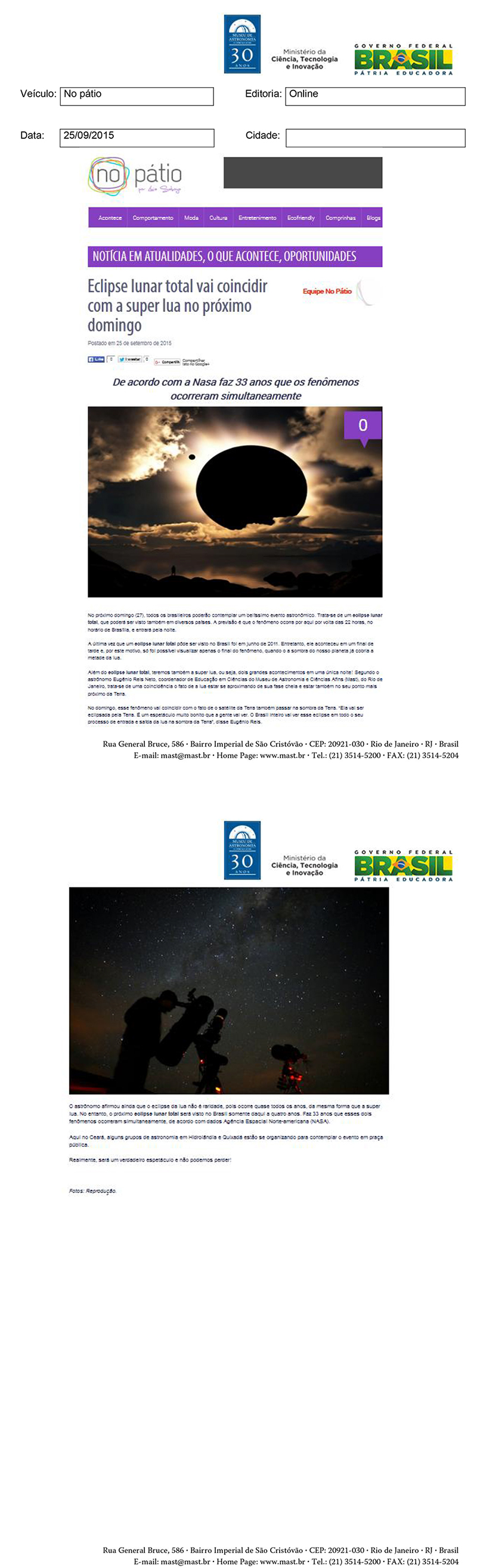 No Pátio | Eclipse lunar total vai coincidir com a super lua no próximo domingo