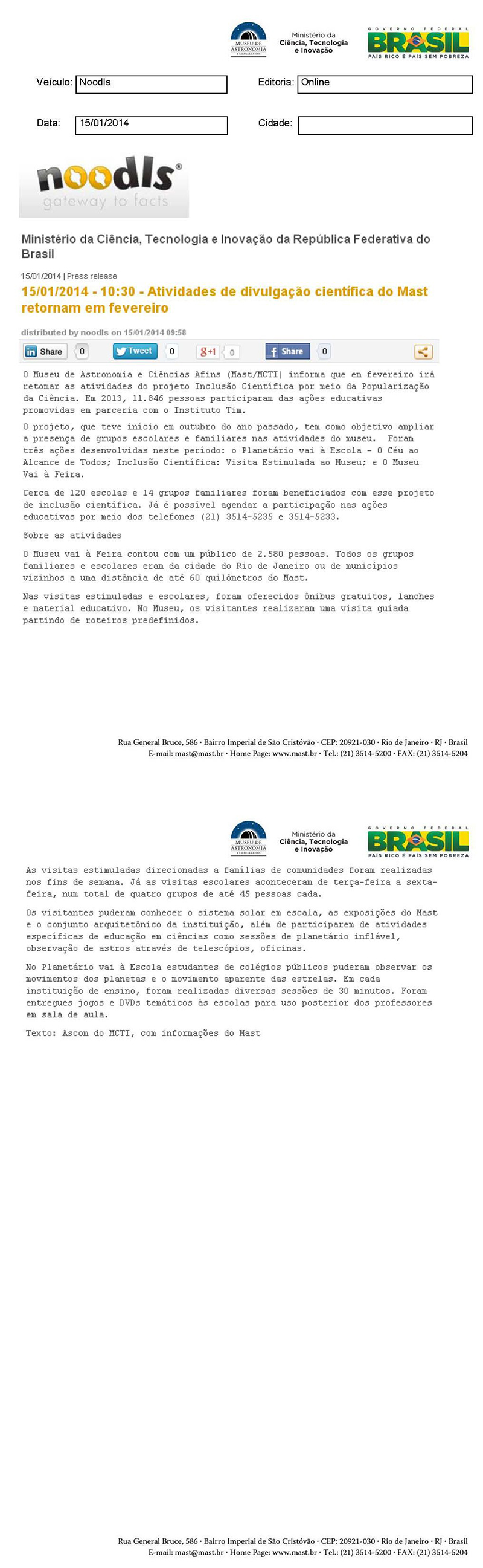 Noodls | Atividades de divulgação científica do MAST retornam em fevereiro
