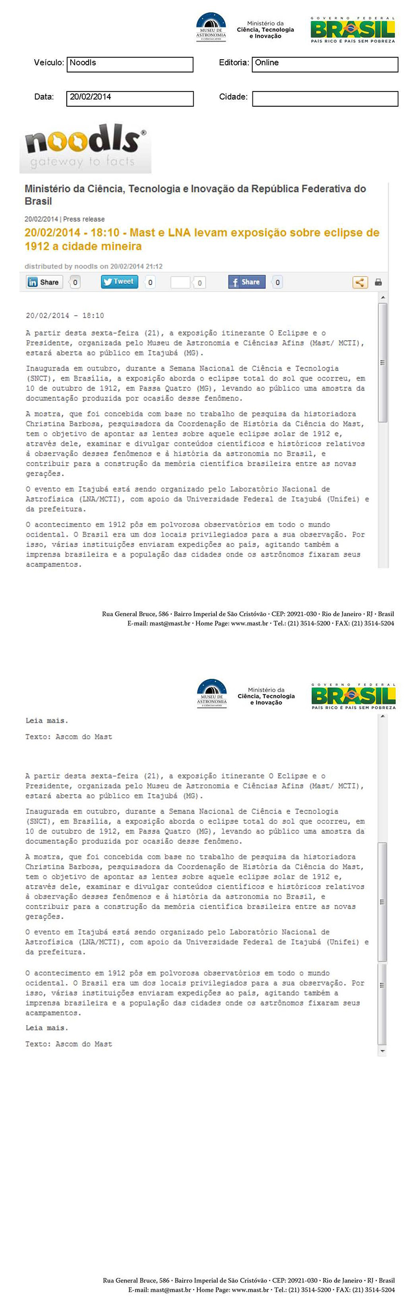 Noodls | MAST e LNA levam exposição sobre eclipse de 1912 a cidade mineira