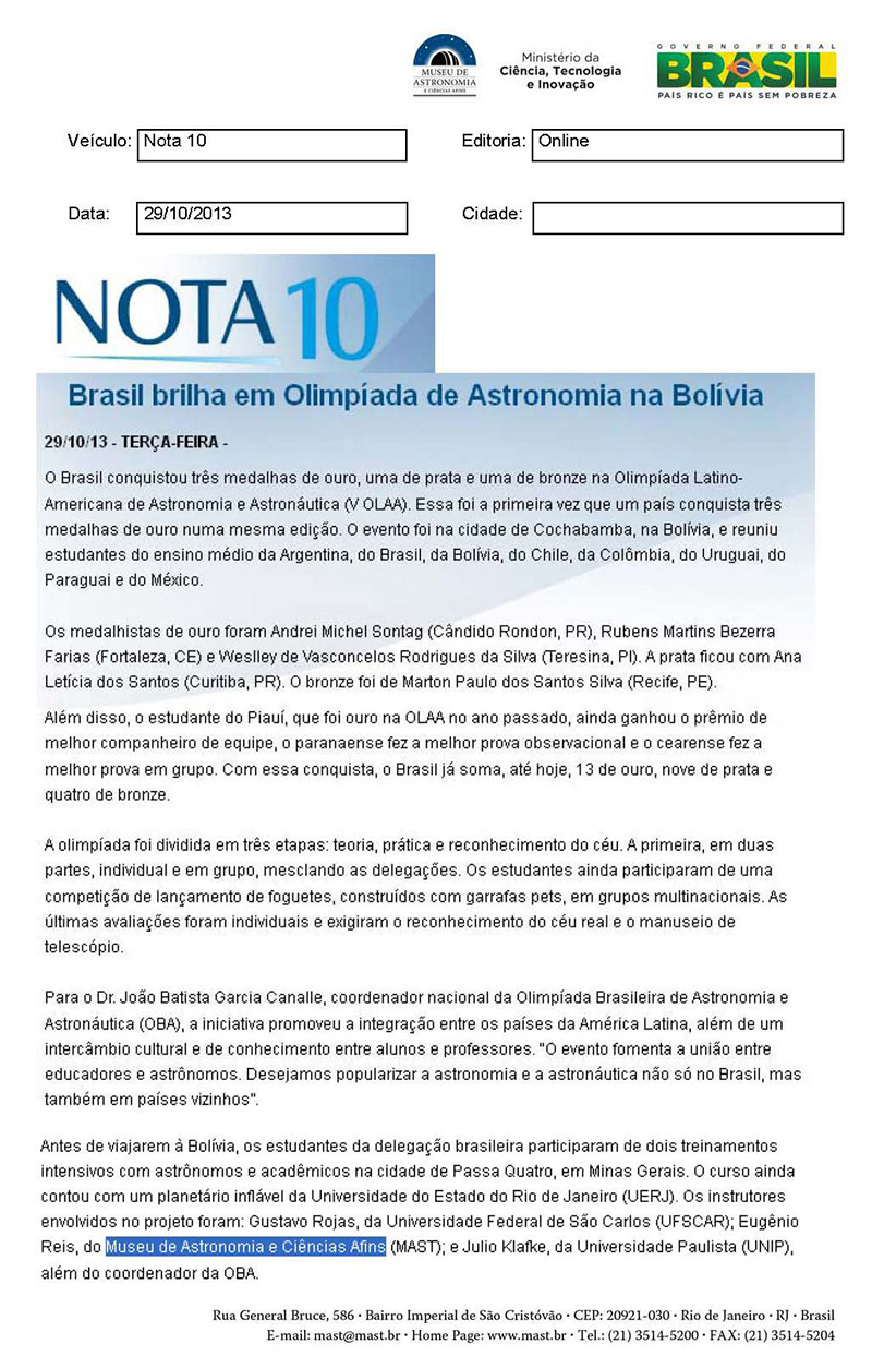 Nota 10 | Brasil brilha em Olimpíada de Astronomia na Bolívia