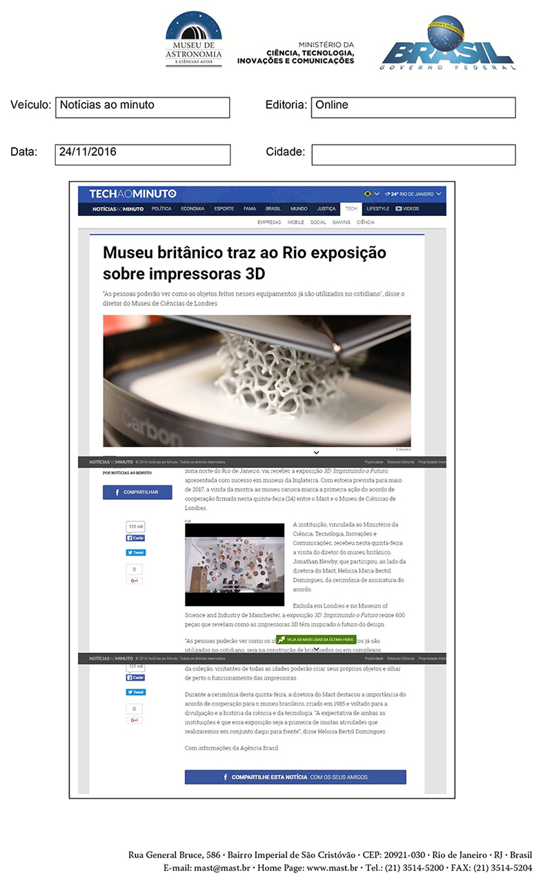 Notícias ao Minuto | Museu britânico traz ao Rio exposição sobre impressora 3D