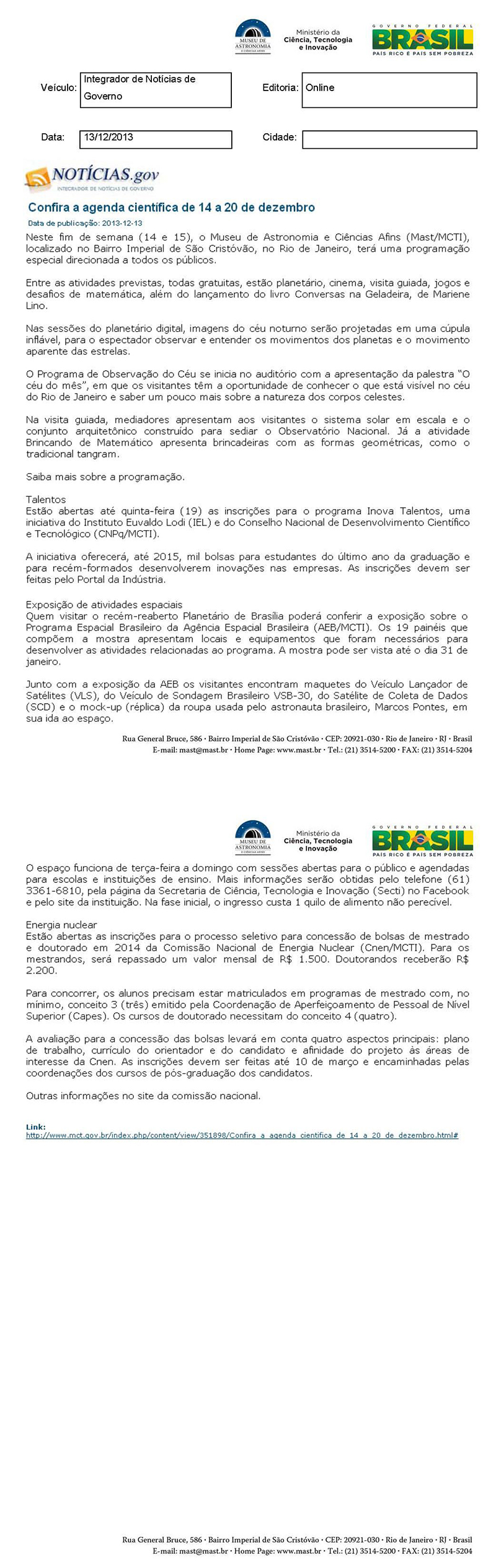 Notícias.gov | Confira a agenda científica de 14 a 20 de dezembro