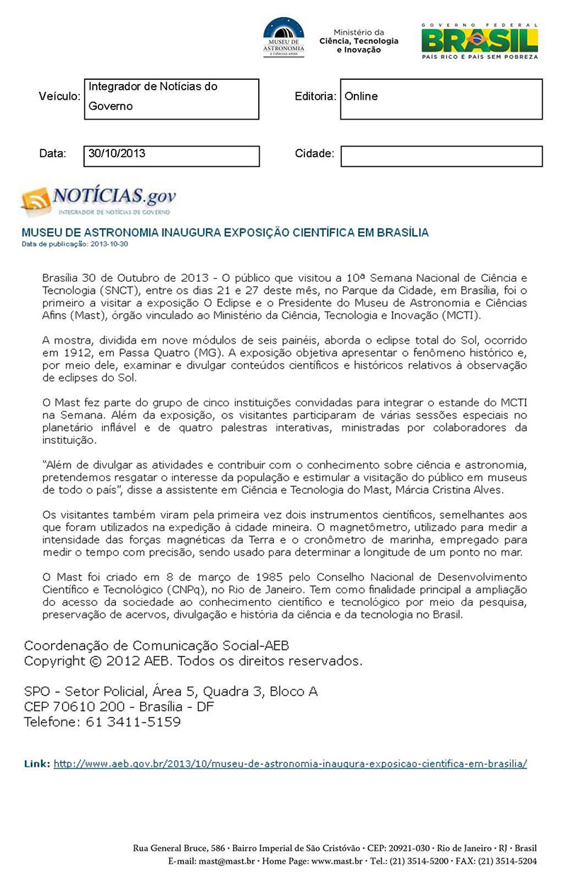 Notícias.gov | Museu de Astronomia inaugura exposição científica em Brasília