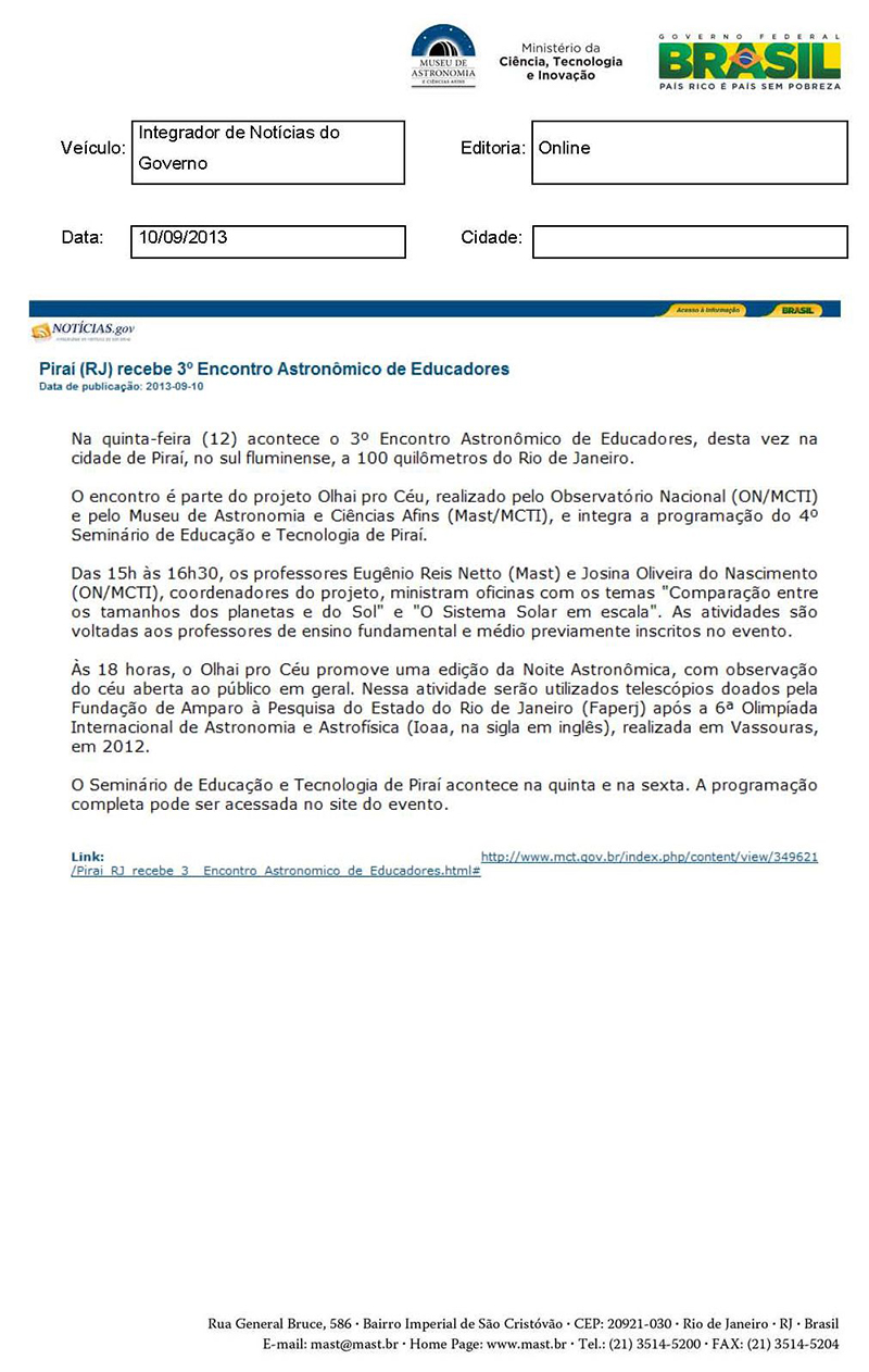 Notícias.gov | Piraí (RJ) recebe 3º Encontro Astronômico de Educadores