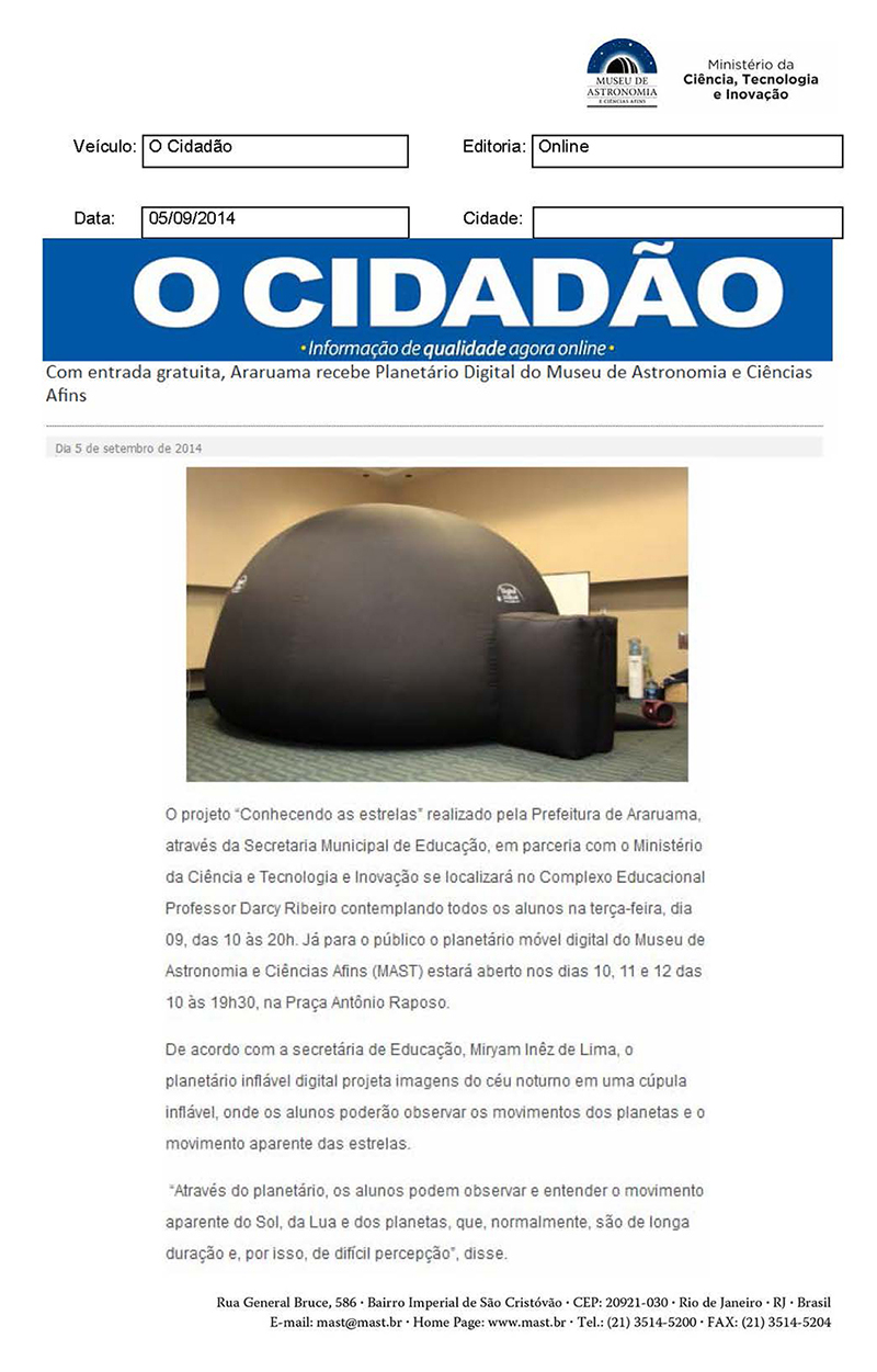 O Cidadão | Com entrada gratuita, Araruama recebe Planetário Digital do Museu de Astronomia e Ciências Afins