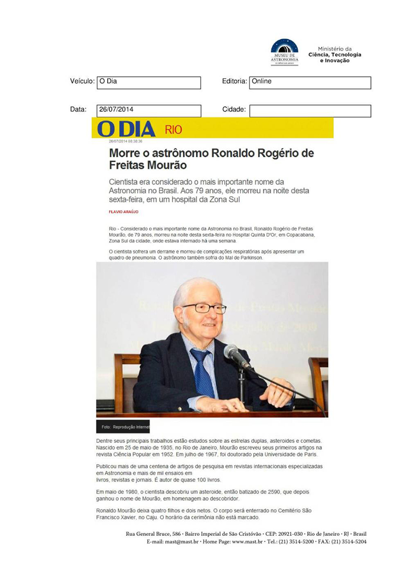 O Dia | Morre o astrônomo Ronaldo Rogério de Freitas Mourão