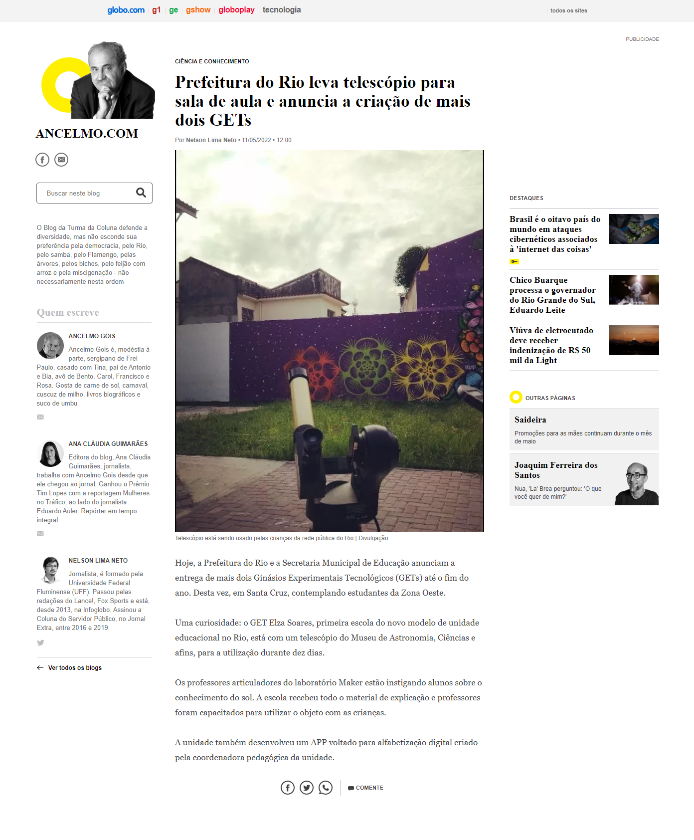 O Globo / Coluna Ancelmo Góis - MAST na nota "Prefeitura do Rio leva telescópio para sala de aula e anuncia a criação de mais dois GETs"