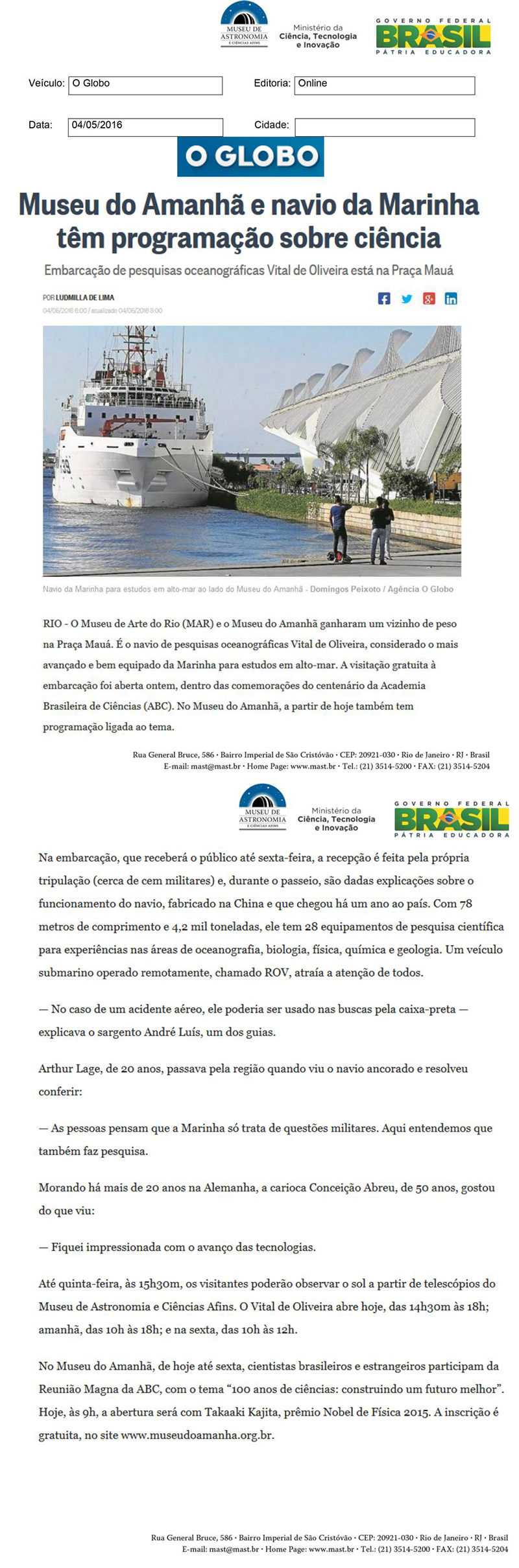 O Globo | Museu de Amanhã e navio da Marinha têm programação sobre ciência