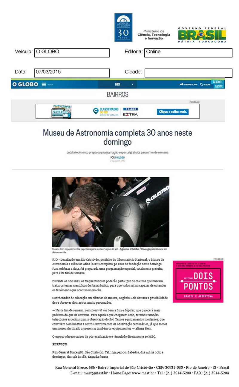 O Globo | Museu de Astronomia completa 30 anos neste domingo