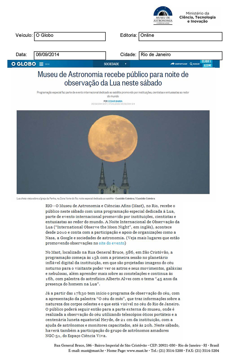 O Globo | Museu de Astronomia recebe público para noite de observação da Lua neste sábado