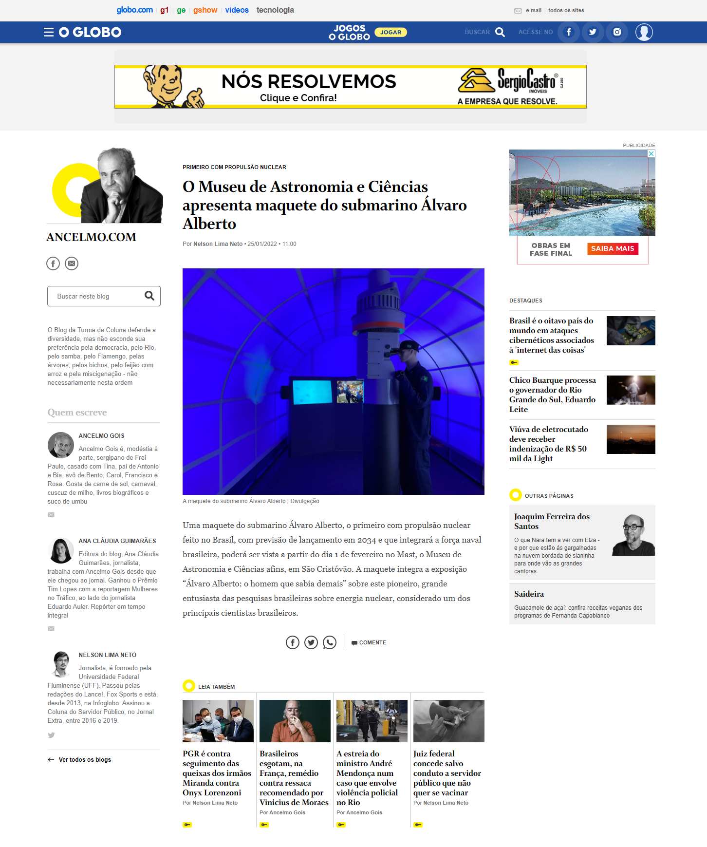 O Globo on-line / Coluna Ancelmo Góis - O Museu de Astronomia e Ciências apresenta maquete do submarino Álvaro Alberto