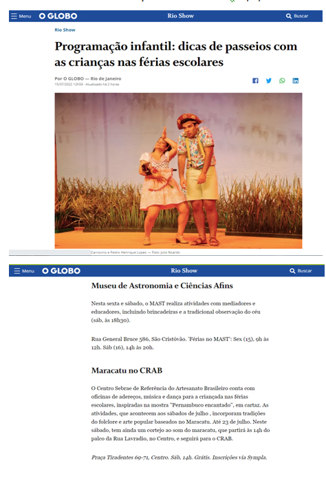 O Globo on-line / RioShow - Férias no MAST na reportagem "Programação infantil: dicas de passeios com as crianças nas férias escolares"