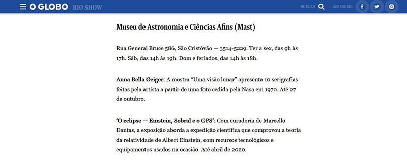 O Globo online / Rio Show | Exposições 'Anna Bella Geiger - Uma Visão Lunar' e 'O Eclipse - Einstein, Sobral e o GPS