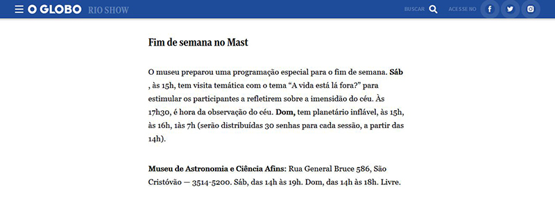O Globo online - Rio Show - Roteiro Infantil | Fim de Semana no MAST