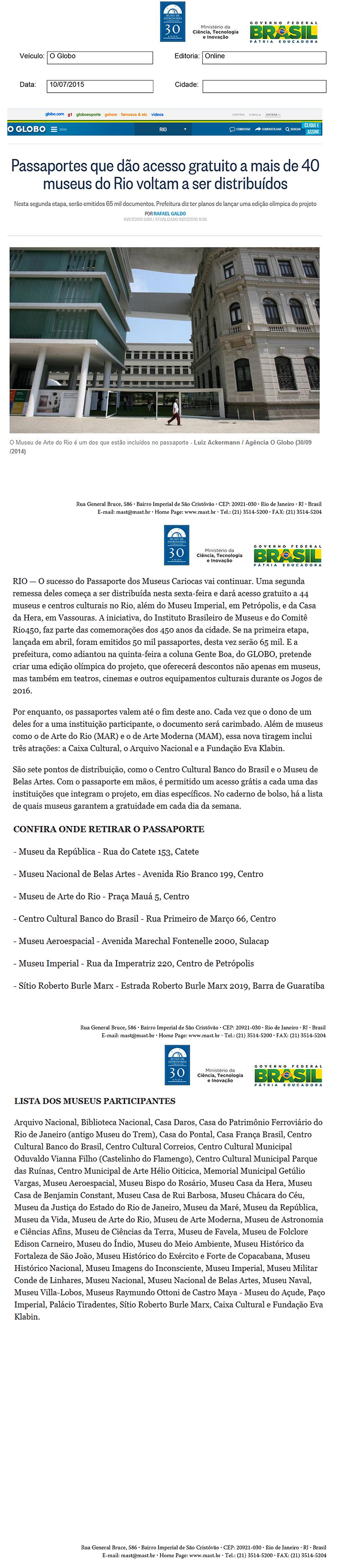 O Globo | Passaportes que dão acesso gratuito a mais de 40 museus do Rio voltama ser distribuídos
