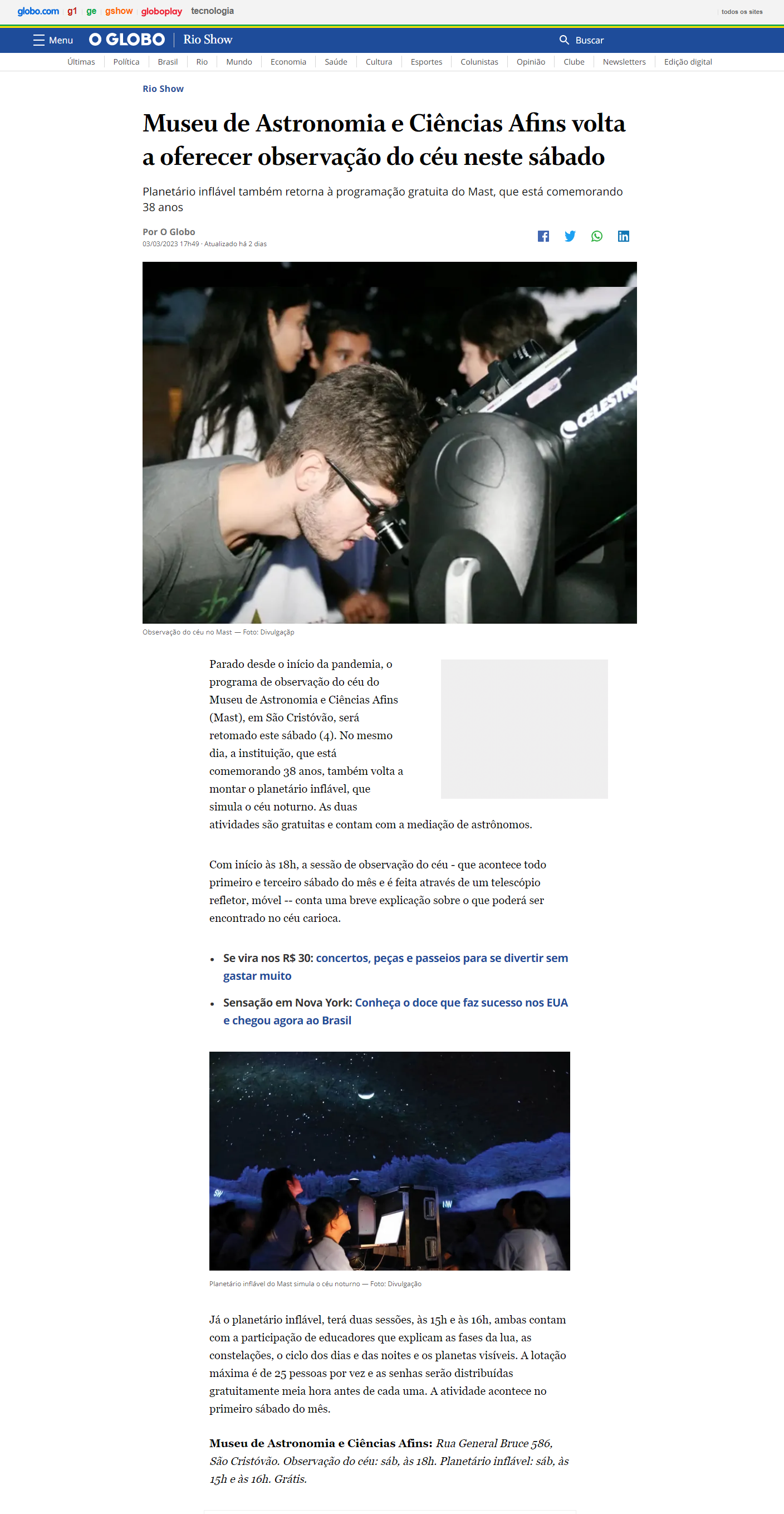 O Globo | Rio Show - Museu de Astronomia e Ciências Afins volta a oferecer observação do céu neste sábado
